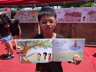 由嘉義縣朴子國小26名畢業生花了半年時間繪製、第一本與朴子老街有關的繪本「勇創蜈蚣陣」,今天新書發表。圖/黃煌權