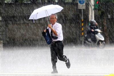 持續受西南風影響,鋒面滯留水氣多,北台灣午後降下大雨,突如其來的雨勢讓外出民眾即使有帶傘,仍趕緊找地方躲雨。圖/王騰毅