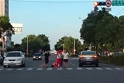 寶桑國中女學生劉明珍 (左紅衣者)、潘宇歆 (右白衣者),昨天放學時看到婦女車禍倒地,2人肉身擋車護傷者,他們的義行被民眾拍下放在臉書上。圖/中央社