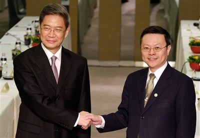 國台辦主任張志軍(左)今天下午與陸委會主委王郁琦(右)在飯店會場握手後,雙方人馬展開會談。圖/法新社