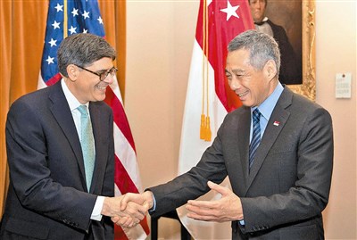 美國財政部長盧傑克(左)二十三日在華盛頓的美國財政部,會見新加坡總理李顯龍。圖/法新社