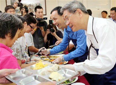 張志軍(右一)今天在朱立倫(右二)陪同下走訪土城頂埔托老中心,朱立倫提醒張志軍,他們要和老人共餐卻沒付錢,所以兩人就一起幫長者打菜,換得一餐,隨後並與長者用餐話家常。圖/台北市攝影記者聯誼會提供