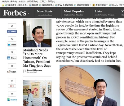 馬英九接受富比士雜誌專訪,談及兩岸關係。圖/取自富比士網頁