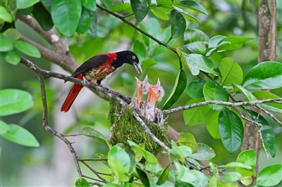 【本報台北訊】6月上旬,有宜蘭縣攝影學會會員在冬山鄉仁山植物園收費停車場的一棵樹上,發現有1對「朱鸝」築巢育雛,巢中還有4隻初出殼的雛鳥,鳥友們主動聘請保全守護、拉封鎖線,4隻朱鸝雛鳥這幾天平安離巢,結束了一場很溫馨的護鳥大作戰。