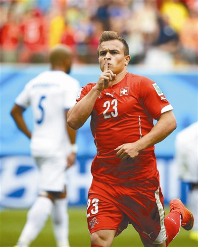 他昨天終於開張,在開賽六分鐘踢進個人在世足第一球,又在第三十一分鐘、第七十一分鐘進球,單場三連發。成為致勝英雄,他自豪地說:「非常開心,但更棒的是球隊晉級,這讓我覺得非常驕傲。」沙基里是瑞士從一九五四年起,六十年來首位在世足上演帽子戲法的球員。