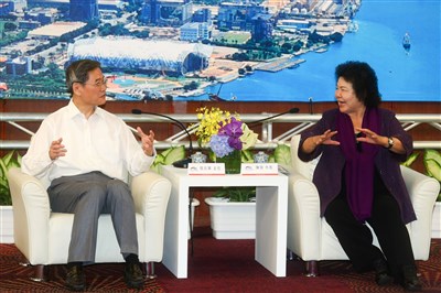 大陸國台辦主任張志軍(左)上午到高雄,拜會市長陳菊(右) ,雙方在正式進行會談前,先相互寒暄。圖/王騰毅