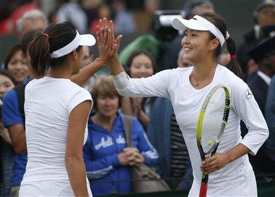 溫網女雙首輪,大會頭號種子謝淑薇/彭帥26日贏球後開心互相擊掌。圖/中新社