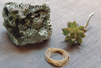 耐旱的特性,育成附石盆栽極為合適。摘取石蓮結實飽滿的葉,葉片先置於一旁讓小傷口風乾;趁此時間(約一小時)就可來挑選整理石材。