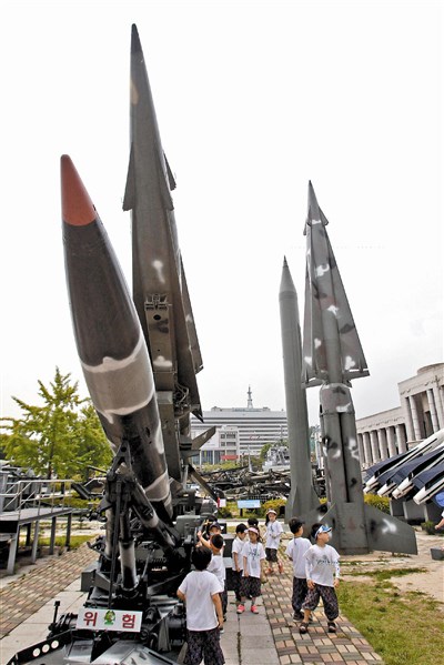 北韓二十九日又射導彈,南韓消息說發射的是短程的飛毛腿導彈。圖為首爾南韓戰爭博物館展示的導彈,飛毛腿在右二。