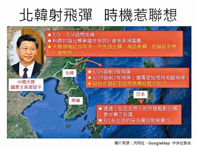 【本報綜合外電報導】北韓昨天凌晨又再發射兩枚導彈,時間點就在中國國家主席習近平訪問南韓在即,北韓此舉被指是「武力示威」,不乏對中國優先訪南韓表達不滿的情緒在內。