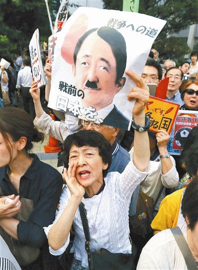 日本示威者六月三十日在首相安倍晉三官邸前抗議集體自衛權的解禁,高舉將安倍畫成希特勒的海報。圖/美聯社