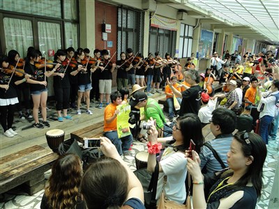 【本報花蓮訊】今年拿下全國學生音樂比賽優等的台北介壽國中弦樂團,今天中午才一出花蓮火車站門口,花蓮黎明教養院身心障礙院生演奏非洲鼓歡迎他們的到來,50名團員隨即拿出樂器演奏電影《魔女宅急便》中插曲〈看見海的街道〉,用快閃行動支持大肯兒(成人自閉症),美妙樂聲引來旅客注意,紛紛拿出手機、相機攝錄不停。