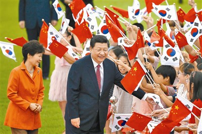 習近平昨天展開訪韓行程,早上偕同夫人彭麗媛抵達首爾機場,南韓外交部長尹炳世等高級官員在舷梯旁迎接。下午赴南韓總統府與朴槿惠會談,就兩國關係、北韓核武問題以及日本解禁集體自衛權等事宜,深入交換意見。兩位元首在會談結束後發表聯合聲明,為兩國戰略合作夥伴關係繪製了藍圖。