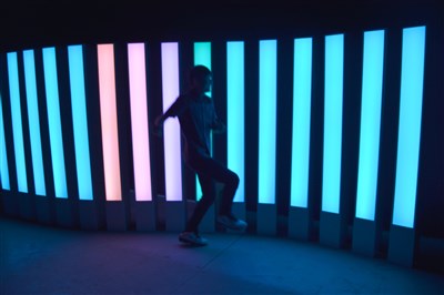 遊客穿縮體感探索館「音柱」牆,不僅牆面顏色會變化,還會發出不同音階聲響。 圖/莊旻靜