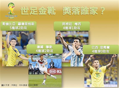 【本報綜合外電報導】世界杯足球賽來到八強階段,誰穿金靴備受矚目。本屆世足金靴獎競爭激烈,J羅、涅馬爾、梅西和穆勒大顯神威,而能帶領球隊一路晉級四強甚至決賽的球星穿金靴希望更濃。