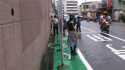 交通局指出,設置人行道標線彩色鋪面後,寬度可供乘客候車及其他行人通過,汽機車行駛或公車靠站,則可明確避開人行空間,也可避免汽機車臨時停車占用候車空間,若真有違規停車,取締執法也更有依據。