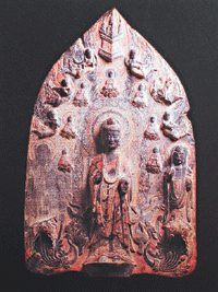 在蓮瓣形背光上,浮雕一佛二菩薩三尊立像,主尊佛有水渦紋、高肉髻,面相清秀,表情和悅,其雙肩下削,身著衣紋線條流暢,向外飄揚,佛手作施無畏和與願印,跣足靜立圓台上。