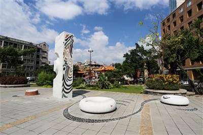 【本報新北訊】在新莊中正路上,有個奇形怪狀的裝置藝術,一根圖騰石柱搭配兩塊甜甜圈狀的石頭,許多路過民眾以為是椅子便坐上去,設計者黃清輝解釋,這個公共藝術名稱為「守護、平安」,取材自新莊特色名產「鹹光餅」,圖騰柱則是官將首的臉譜,是可以代表新莊傳統文化的作品。