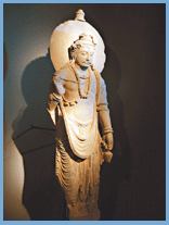 中國早期的佛教造像深受印度影響,其中尤以古印度的犍陀羅(今巴基斯坦西、北部與東阿富汗)為甚。這尊犍陀羅的彌勒菩薩像雕刻於三世紀,一手上揚,一手下垂持瓶,身著天衣,上身裸露,手頸佩戴腕釧與瓔珞,是當時印度犍陀羅地區流行的彌勒菩薩像形式。