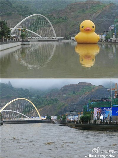 【本報綜合報導】「7月15日起,貴陽市出現持續強降雨。隔日晚間7時左右,風靡全球的大黃鴨(台灣稱黃色小鴨)在貴陽市南明河中被洪水沖走。」中國大陸貴州省近來暴雨連連,竟把展出中的黃色小鴨沖走了,這是黃色小鴨全球巡展中首度「失蹤」,貴州省政府昨晚在官方微博發出這則「失蹤」消息,並祭出重金獎賞,盼全民一起協尋。