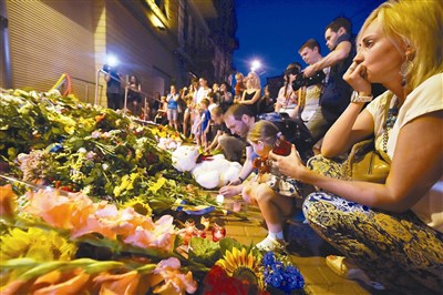 馬航MH17班機十七日疑似在鄰近俄羅斯邊界的烏克蘭領空遭到BUK飛彈擊落之後,大批民眾當晚聚集在荷蘭駐基輔大使館前,哀悼罹難的近三百名該機乘客及機組員。圖/法新社