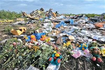 民眾在馬航MH17班機的失事地點擺放鮮花與玩具悼念死者,現場仍是一片混亂。圖/法新社