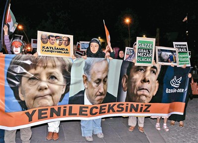 將近五千名支持巴勒斯坦的土耳其人,十九日在土耳其首都安卡拉美國大使館外示威,抗議以色列對加薩走廊發動地面攻擊,橫幅從左到右印著德國總理梅克爾、以色列總理納坦雅胡、美國總統歐巴馬的肖像,底下標語寫著「你們這些人必敗」。圖/美聯社