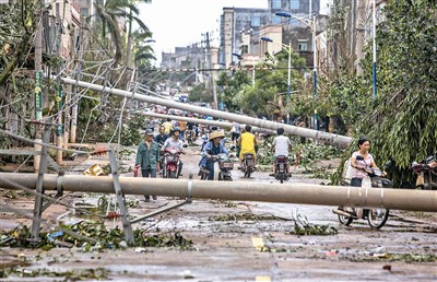 雷馬遜颱風十九日掃過大陸廣東省雷州市,吹倒許多路樹和電線桿,造成交通阻塞,許多人無電可用。雷馬遜颱風引發的土石流造成至少十七人死亡。圖/路透