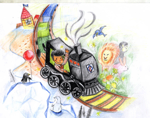 火車喀隆喀隆地開來,我的腦袋進入了神秘的世界,我要搭乘的是一輛魔法列車嗎?那我的目的地將會是古老的魔法城堡,遙遠的北極世界,荒蕪寂靜的沙漠,或是動物狂奔的大草原吧!媽媽輕撫我的臉頰,告訴我目的地到了。