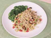1.松子炒香,香菇泡水與素肉切丁,毛豆、筍丁、花椰菜汆燙備用。