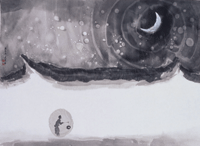 我起身走到窗前。綿綿細細的白雪自高高的天上緩緩滑翔而下。屋頂、枯枝、地面,附著銀白薄膜,在滿黑的天地間,尤為明淨。我的心頓時充盈。那種晶瑩無瑕的美,豈是從人間來!