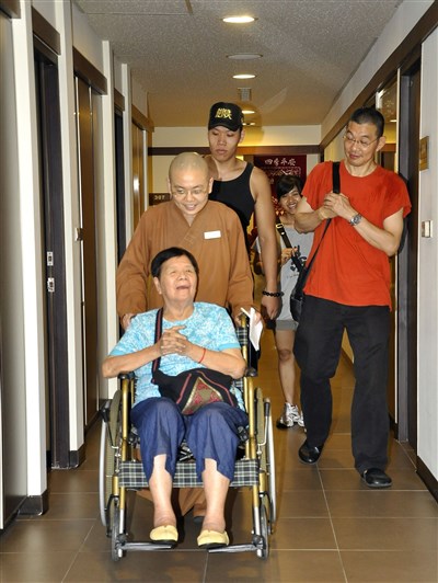 高雄氣爆附近民眾不敢留在家,藝術家石晉華為讓媽媽安心,安置在高雄佛光山南屏別院由住持妙樂法師接待。圖/記者邱麗玥