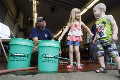 俄亥俄州消防隊員與兒童合作把桶子裝滿水。俄州州長宣布該州西北地區進入緊急狀態,籲請該地40萬民眾勿喝供水系統的水。圖/美聯社