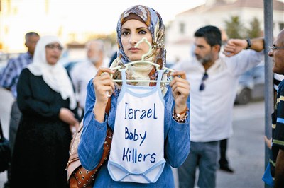 一名約旦反對黨人士三日參加在約旦首都安曼美國大使館前的抗議活動,要求以色列停止對加薩的攻擊。她手持一件孩童衣服,上面寫著:「以色列是嬰孩殺手」。圖/路透