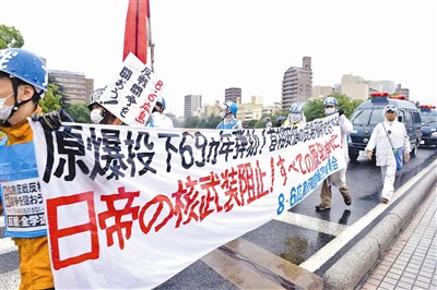 在日本廣島市和平公園舉行的廣島遭原子彈轟炸六十九周年紀念活動上,日本民眾打出條幅,呼籲阻止日本「核武化」,要求彈劾首相安倍。