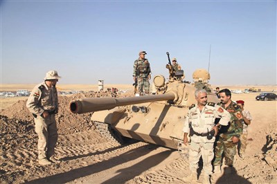 美軍戰機八日攻擊向伊拉克北部庫德族自治區首府厄比爾挺進的伊斯蘭國激進分子。圖為庫德族部隊當天在卡瑟區的前線部署,共同遏止伊斯蘭國激進分子。圖/路透