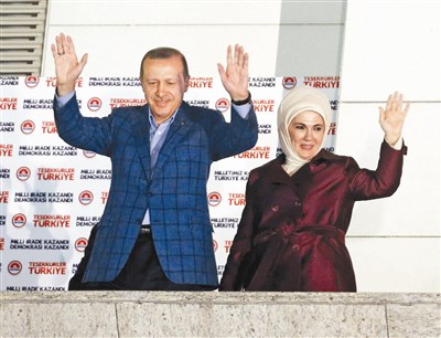 土耳其總統選舉十日開出百分之九十九的選票後,總理艾爾段以百分之五十一點九的得票率,贏得土國首任民選總統,艾爾段夫婦在執政黨正義與發展黨總部接受支持者歡呼。圖/法新社
