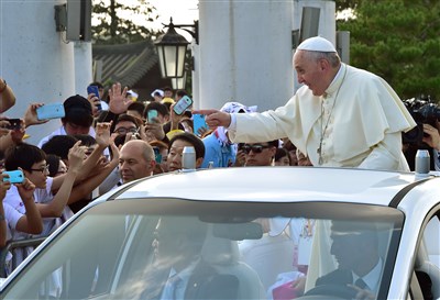 當教宗搭乘普通敞篷轎車穿過街道前往體育場,數千名未獲入場券的民眾沿途歡呼、揮舞旗幟歡迎教宗,車隊走走停停,讓方濟為孩童或父母懷中的嬰孩獻祝福。