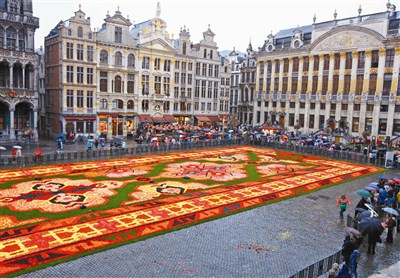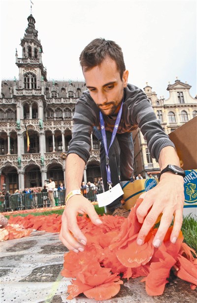 在比利時首都布魯塞爾市中心,兩年一度的「鮮花地毯」活動揭幕,近百名工作人員、使用約六十萬朵鮮花,為布魯塞爾大廣場鋪上一條絢麗繽紛的地毯,整個鋪設過程歷時七個多小時。