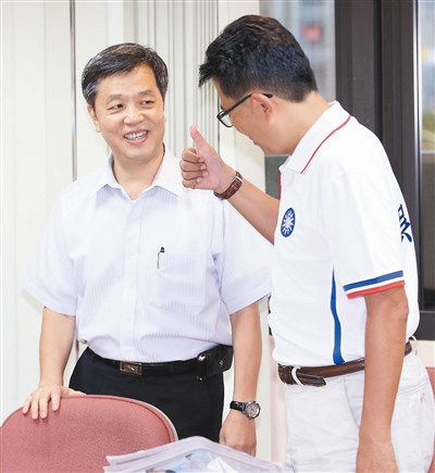 台北市副市長陳雄文(左)接任勞動部長,消息傳出,昨天出席北市議會黨團便當會時,議員吳世正(右)豎起大拇指向他道賀。圖/林澔一