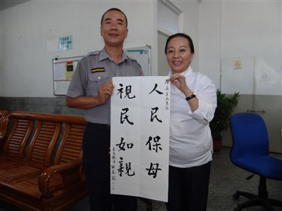 光榮派出所警員吳庸嘉(左),熱心為管區內1名自殺身亡的男子料理後事,還當了1天「孝男」,讓縣長張花冠(右)非常感動,寫了「人民保母、視民如親」筆墨送給吳庸嘉,表彰他的愛心與善行。圖/黃煌權