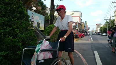 劉成勛住在民族路上,每天風雨無阻,用長夾子拾起地上垃圾,再放到輪椅上。他說,重複彎腰的動作雖然很累,但見到街上的垃圾被他一掃而空,心裡就很高興,疲憊感也跟著垃圾被掃除了。