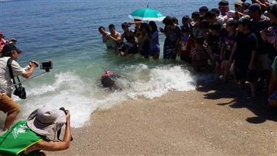 今天野放的綠蠵龜,昨晚剛上岸產下百餘顆龜卵;程一駿說,每年5至10月是綠蠵龜登島產卵的季節,據統計,從2011年至今年,已有12隻母龜上岸產下約60窩卵,產卵沙灘遍布全島,平均每頭母龜產下4至8窩卵,每窩有百來顆龜卵,初估每窩孵化後有約4800隻小海龜游回大海。