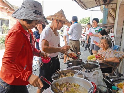 有時午餐時間接近,鄰居月英嬸就會將左鄰右舍提供的食材料理成豐盛大餐,一群人就地共餐;八十五歲的許梁日更是天天都來報到,在這裡找到生活重心。
