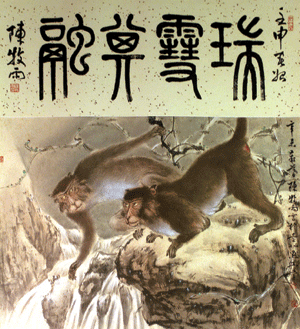 猴子同時也給人調皮機靈的印象,畫家也很喜歡畫出猴子的這類可愛性格。附圖的這幅猴畫,上面詩堂題為:「瑞雪其融」。以前在農業時代,冬天有大雪,意謂著來年有豐沛的水量以供灌溉,所以雪被稱為「瑞雪」,是吉利的象徵。雪融了,春天悄悄的到來,兩隻猴子攀著剛冒出一點點嫩芽的藤蘿,用手去試探水的溫度,想喝水;或者是寒冬太久,好不容易等雪融了,想下水大玩一場!