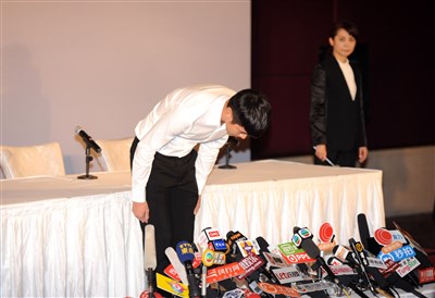 柯震東在中國大陸北京麗晶酒店舉行記者會,為吸食大麻的錯誤行為向社會大眾鞠躬道歉。圖/新華社