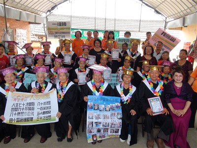 【本報台中訊】弘道老人福利基金會今年6月推動「百歲小學堂」,教導清水區海風社區20位平均年齡80歲的長輩學習識字,今天上午舉辦畢業典禮,長輩們穿上學士服,戴上學士帽,神采奕奕的接受證書,十分開心。