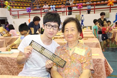 最年輕的參賽者是4歲的羅以心,與阿嬤張謝淑貞,報名參加祖孫組。張謝淑貞說,老少配搭檔參賽很有意思,和孫女一起彈撥練習算盤,非常有趣。