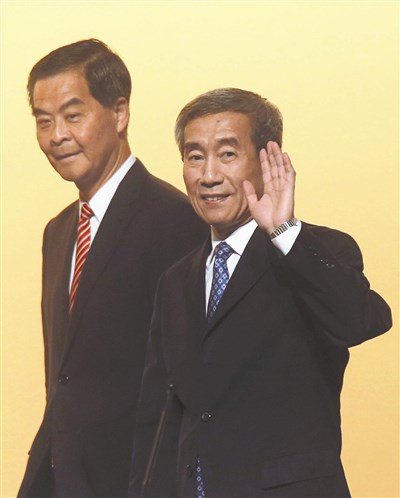 中國大陸全國人大常委會副祕書長李飛(右圖右)一日上午說明香港特首普選決定,香港立法會民主派議員在會場舉「中央失信」等標語抗議(上圖)。右圖左為香港特首梁振英。圖/路透