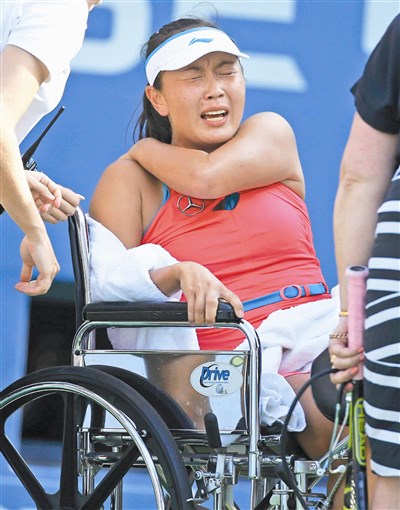 大陸網球高手彭帥,五日於美國網球公開賽四強賽負傷,表情痛苦、坐著輪椅離開球場。圖/路透